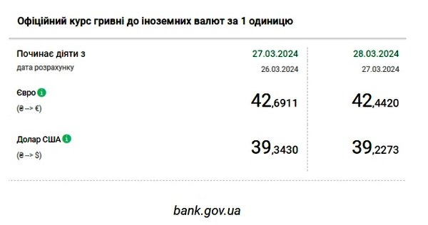 Национальный банк Украины (НБУ) снизил курс доллара к гривне. Доллар подешевел после исторического максимума. Об этом сообщает РБК-Украина со ссылкой на данные на сайте регулятора. Официальный курс на 28 марта 2024 года установлен на таком уровне: 39,2273 гривен за 1 доллар (-0,1157 грн). Курс евро составит 42,442 гривен за 1 евро (-0,2491 грн).