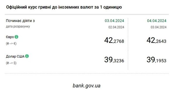 Национальный банк Украины (НБУ) снизил курс доллара к гривне. Доллар подешевел после резкого роста. Об этом сообщает РБК-Украина со ссылкой на данные на сайте регулятора. Официальный курс на 4 апреля 2024 года установлен на таком уровне: 39,1953 гривен за 1 доллар (-0,1283 грн). Курс евро составит 42,2643 гривен за 1 евро (-0,0125 грн). На межбанке курс упал на 17 копеек до 39,15-39,17 грн/доллар (покупка-продажа) по сравнению с закрытием в предыдущий день. На наличном рынке курс вырос на 5 копеек до 39,55 грн/доллар. | |