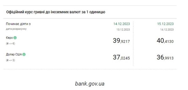 Национальный банк Украины (НБУ) снова опустил курс доллара ниже 37 гривен. В то же время курс евро впервые с августа превысил уровень в 40 гривен. Об этом сообщает РБК-Украина со ссылкой на данные на сайте регулятора. Официальный курс на 15 декабря 2023 года установлен на таком уровне: 36,9913 гривен за 1 доллар (-0,0332 грн). Курс евро составит 40,413 гривен за 1 евро (+0,4913 грн). Курс определяется котировками на международном рынке пары евро/доллар и не зависит от НБУ. На межбанке сегодня курс упал на 7 копеек до 36,96-36,98 грн/доллар (покупка-продажа). На наличном рынке курс упал на 5 копеек до 37,65 гривен за доллар. | |