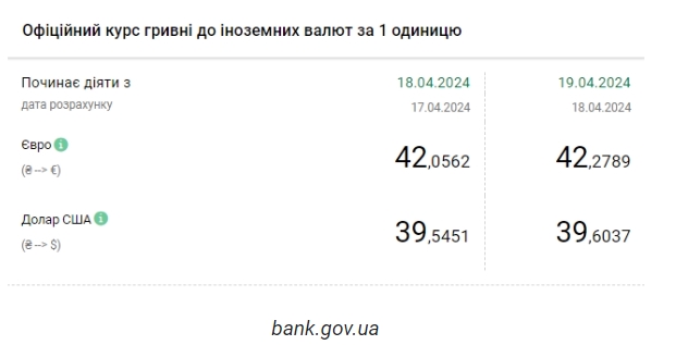Национальный банк Украины (НБУ) повысил курс доллара к гривне. Доллар достиг очередного исторического максимума. Об этом сообщает РБК-Украина со ссылкой на данные на сайте регулятора. Официальный курс на 19 апреля 2024 года установлен на таком уровне: 39,6037 гривен за 1 доллар (+0,0586 грн). Выше курс был только 17 апреля - 39,5737 грн/доллар. Курс евро составит 42,2789 гривен за 1 евро (+0,2227 грн). На межбанке сегодня курс вырос на 9 копеек до 39,67-39,69 грн/доллар (покупка-продажа) по сравнению с закрытием в предыдущий день. На наличном рынке курс вырос на 5 копеек до 39,85 грн/доллар. | |