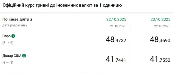 Национальный банк Украины (НБУ) повысил курс доллара к гривне. Доллар подорожал после снижения накануне. Об этом сообщает РБК-Украина со ссылкой на данные на сайте регулятора. Официальный курс на 23 октября 2025 года установлен на таком уровне: 41,755 гривен за 1 доллар (+0,0109 грн). Официальный курс евро составит 48,369 гривен за 1 евро (-0,1042 грн).