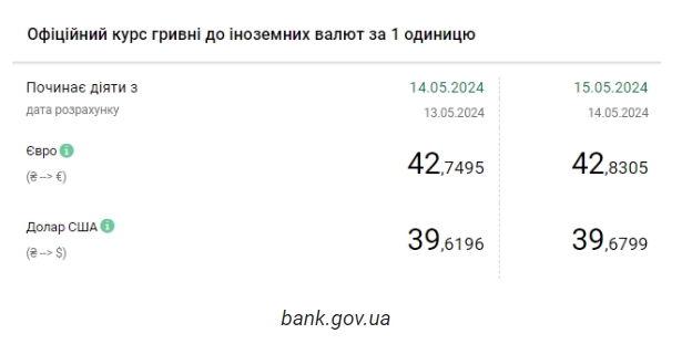 Национальный банк Украины (НБУ) повысил курс доллара к гривне. Доллар подорожал после снижения накануне. Об этом сообщает РБК-Украина со ссылкой на данные на сайте регулятора. Официальный курс на 15 мая 2024 года установлен на таком уровне: 39,6799 гривен за 1 доллар (+0,0603 грн). Курс евро составит 42,8305 гривен за 1 евро (+0,0810 грн). Это исторический максимум. Выше курс был только 10 мая - 42,8148 грн/евро. На межбанке сегодня курс снизился на 6 копеек до 39,64-39,66 грн/доллар (покупка-продажа) по сравнению с закрытием в предыдущий день. На наличном рынке курс вырос на 10 копеек до 40,05 грн/доллар. | |