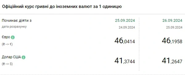 Национальный банк Украины (НБУ) снизил курс доллара к гривне. Доллар подешевел после двухдневного роста. Об этом сообщает РБК-Украина со ссылкой на данные на сайте регулятора. Официальный курс на 26 сентября 2024 года установлен на таком уровне: 41,2647 гривен за 1 доллар (-0,1097 грн). Курс евро составит 46,1958 гривен за 1 евро (+0,1544 грн).