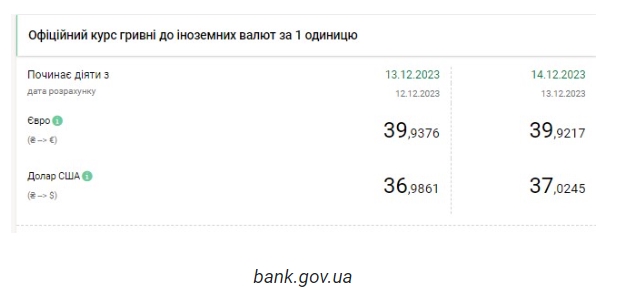Национальный банк Украины (НБУ) впервые в истории поднял курс доллара выше 37 гривен. Однако в отличие от официального обменный курс был значительно выше осенью прошлого года - до 43 гривен. Об этом сообщает РБК-Украина со ссылкой на данные на сайте регулятора. Официальный курс на 14 декабря 2023 года установлен на таком уровне: 37,0245 гривен за 1 доллар (+0,0384 грн). Курс евро составит 39,9217 гривен за 1 евро (+0,0159 грн). На межбанке сегодня курс вырос на 4 копейки до 37,03-37,05 грн/доллар (покупка-продажа). На наличном рынке курс упал на 5 копеек до 37,70 гривен за доллар. | |