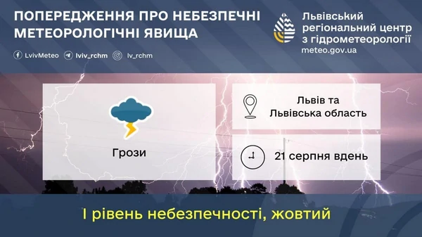Предупреждение об опасных явлениях объявили и для жителей Львовской области, где также будут греметь грозы. Из-за непогоды введен І уровень опасности, желтый.