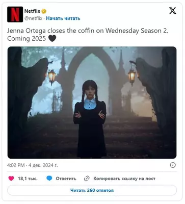 Стриминговый гигант Netflix объявил о завершении съемок второго сезона популярного сериала Уэнздей и поделился первым официальным кадром с главной героиней в исполнении Дженны Ортеги. Соответствующее изображение опубликовано в соцсетях компании, сообщает Variety. Хотя детали сюжета остаются в тайне, создатели обещают, что новый сезон будет еще более запутанным и еще более загадочным. Сериал слагают восемь эпизодов, половину из которых снимает легендарный режиссер Тим Бертон, работавший и над первым сезоном. Первый сезон Уэнздей, вышедший в ноябре 2022 года, стал настоящим хитом. Он рассказывает историю дочери семьи Аддамсов, которая расследует таинственные события в школе Невермор. Внимание зрителей увлек черный юмор, эстетика Бертона и блестящая игра Дженны Ортеги. Сериал собрал миллионы просмотров и получил номинации на престижные награды, а культовый танец Уэнздей стал вирусным в соцсетях. Ожидается, что второй сезон не только продолжит успех первого, но и удивит фанатов неожиданными сюжетными поворотами. Дата премьеры пока не объявлена. | |