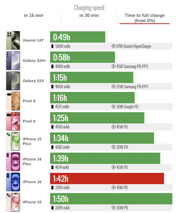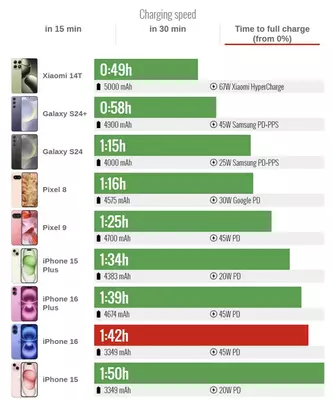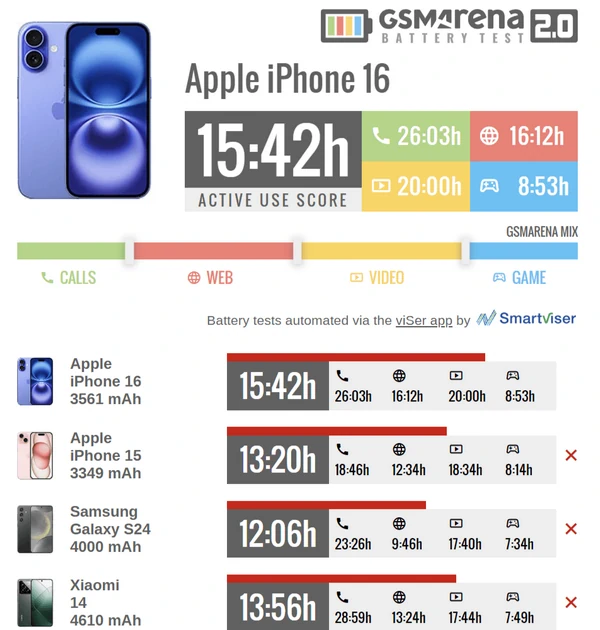 В 2024 году время автономной работы остается одним из главных критериев при покупке смартфона. В прошлом iPhone часто проигрывали Android-устройствам в этом отношении, но в последних поколениях этот недостаток был устранен. Редакторы GSMArena опубликовали результаты тестирования автономности базового iPhone 16. Оказалось, это одна из самых сильных сторон девайса и заметный апгрейд по сравнению с прошлогодним iPhone 15. При активном использовании новый Айфон может протянуть 15 часов 42 минуты. И это несмотря на скромную по меркам Android'фонов батарею на 3561 мАч. Основной конкурент Айфона в лице Samsung Galaxy S24 с аккумулятором 4000 мАч сильно позади с автономностью на уровне чуть больше 12 часов. А Xiaomi 14 с батареей на 4610 мАч (емкость более чем на 1000 мАч выше, чем у iPhone 16) проработал 13 часов и 56 минут. А вот скорость зарядки iPhone 16 не очень конкурентоспособная в своей ценовой категории. Полный цикл зарядки занимает 1 час и 42 минуты, тогда как 30-минутная зарядка доведет заряд батареи только до 59%. | |