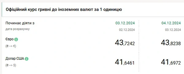 Национальный банк Украины (НБУ) повысил курс доллара к гривне. Доллар обновил исторический максимум второй день подряд. Об этом сообщает РБК-Украина со ссылкой на данные на сайте регулятора. Официальный курс на 4 декабря 2024 года установлен на таком уровне: 41,6972 гривен за 1 доллар (+0,0511 грн). Предыдущий максиму был зафиксирован 3 декабря - 41,6461 грн/доллар. С начала года доллар подорожал на 9,8% (с 37,9824 на 31 декабря 2023 года). Официальный курс евро составит 43,8238 гривен за 1 евро (+0,0996 грн).