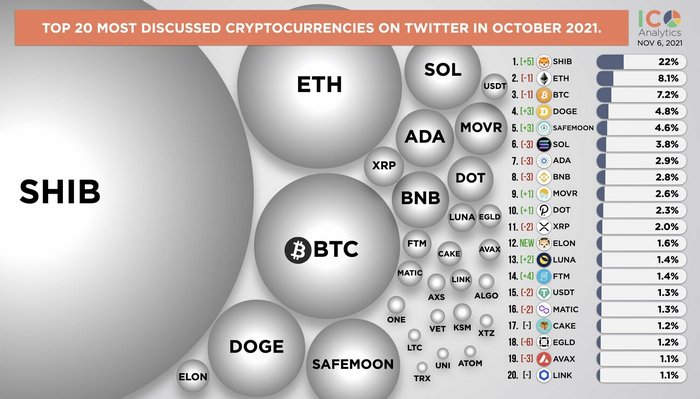 Криптовалюта-мем Shiba Inu в октябре стала самым обсуждаемым криптоактивом в соцсети Twitter. Она обошла не только своего "собачьего" соперника Dogecoin, но и даже первую криптовалюту Bitcoin, сообщает Обозреватель.Как свидетельствуют данные аналитической платформы ICO Analytics, в этом месяце на Shiba Inu приходилось 22% от упоминаний всех криптоактивов. Таким образом, ни одна другая криптовалюта даже и близко не смогла приблизиться к этому токену по популярности в Twitter. В октябре Shiba Inu поднялся в рейтинге упоминаемости сразу за пять позиций - в сентябре токен занимал лишь шестое место. В целом топ-20 самых популярных криптовалют выглядят так: