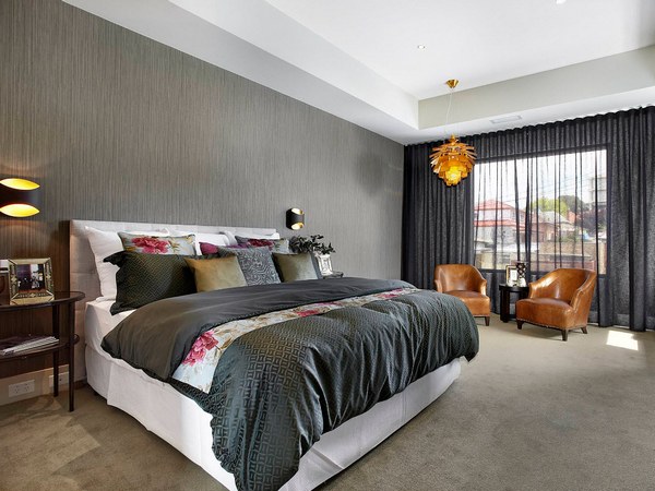 Еще одним актуальным трендом по праву можно назвать темную акцентную стену. В этом случае могут использоваться обои с контрастной фактурой, акцентирующей на себе фокусное внимание.
