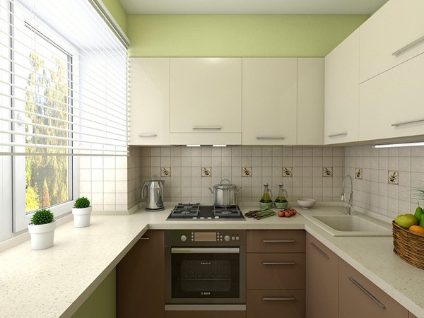 Оптимальный вариант — угловая кухня. Она по максимуму займет место у стен, холодильник же лучше всего поставить у окна плиту рядом с ним. Обязательно использовать верхние навесные шкафчики, пусть и компактные, но где как не в них хранить всякие мелочи. И все дверцы у верхних шкафчиков должны быть с подъемными механизмами, тогда они точно смогут открываться, а не упрутся в стену или в соседний шкаф. Подоконник можно и нужно использовать как дополнительную поверхность полку, поставить туда допустим микроволновку либо другую малогабаритную кухонную технику.