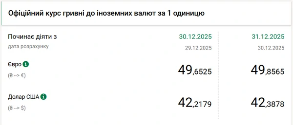 Национальный банк Украины (НБУ) увеличил курс доллара к гривне — на 17 копеек. Об этом сообщает РБК-Украина со ссылкой на данные на сайте регулятора. Официальный курс доллара на 31 декабря 2025 года установлен на таком уровне: 42,3878 гривен за 1 доллар (+0,17 грн). Официальный курс евро составляет 49,8565 гривен за 1 евро (+0,20 грн).