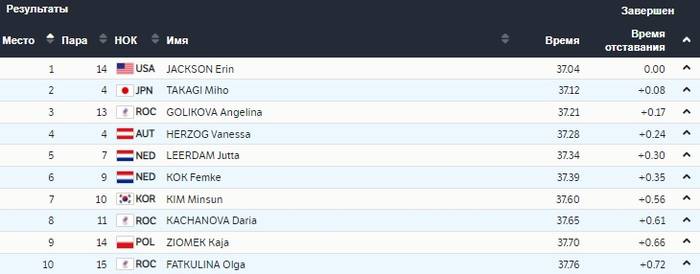 В воскресенье, 13 февраля, в Пекине (Китай) прошли соревнования по шорт-треку у женщин на дистанции 500 метров. В финальном заезде принимало участие 30 спортсменок, которые были поделены на 15 пар. Победительницей соревнования стала представительница США Эрин Джексон, которая показала время - 37.04. Второе место заняла спортсменка из Японии Михо Такаги (37.12). Тройку лучших замкнула представительница ОКР Ангелина Голикова (37.21). | |