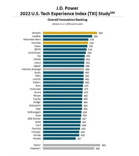 Так, самым инновационным автобрендом признан Genesis. Это премиум-подразделение Hyundai набрало 643 балла по 1000-бальной шкале индекса инновационности. На втором месте оказался Cadillac (584 балла), на третьем - Mercedes-Benz (539).Среди непремиальных брендов лидирует Hyundai с 534 баллами. Tesla набрала даже больше, чем Genesis - 681 балл, однако лидером не стала, так как автопроизводитель не позволяет не согласился рассекретить информацию обо всех покупателях своих авто. Поэтому выборка по владельцам Tesla оказалась недостаточной для попадания в рейтинг. Самые высокотехнологичные авто 2022 года: