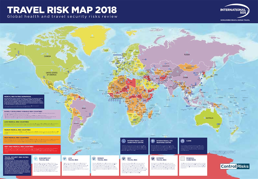 Международная организация International SOS, которая занимается безопасностью путешественников по всему миру, обнародовала карту самых опасных стран мира для туристов в 2018 году. Карта была опубликована на сайте компании.Среди наиболее неблагоприятных направлений оказались Сирия, Йемен, Сомали, Ливия, Ирак, Центральноафриканская Республика, Гвинея-Бисау, Афганистан и Бурунди. Все эти страны значатся в категории с "экстремальным уровнем риска". При этом самыми безопасными были названы Норвегия, Дания, Швейцария, Финляндия, Исландия, Люксембург и Словения. Украина оказалась в категории со средней степенью риска. | |