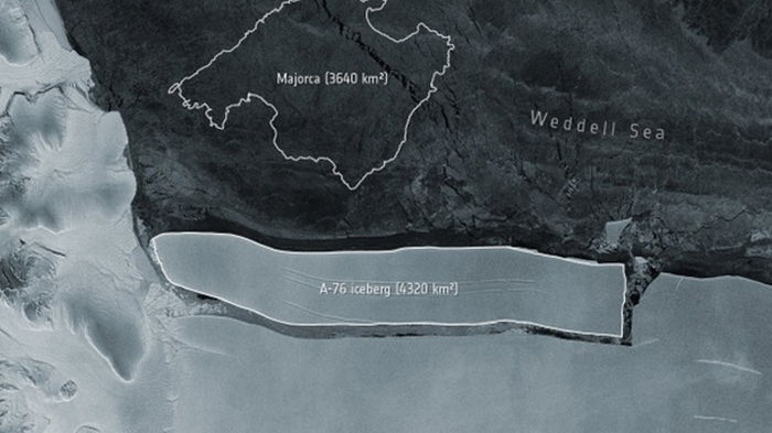 На днях от Антарктиды откололся самый большой в мире айсберг. Об этом сообщило Европейское космическое агентство (ЕКА) со ссылкой на данные спутника Sentinel-1.Гигантский айсберг обнаружили британские и американские ученые, которые анализировали снимки с аппарата наблюдения за Землей. Его площадь составляет примерно 4320 кв. километров. Айсберг получил обозначение А-76. Как указали в ЕКА, он имеет длину 170 километров и ширину 25 километров. Подчеркивается, что по площади А-76 чуть больше испанского острова Мальорка. ![]()