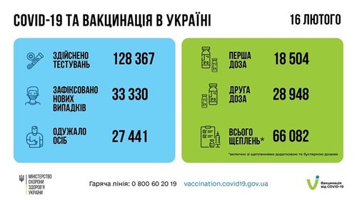 В Украине за сутки от коронавируса вакцинировались более 66 тысяч человек. Об этом сообщает Минздрав в четверг, 17 февраля. Накануне в Украине 66 082 человека вакцинированы против COVID-19. Первую дозу получили 18 504 человека, вторую дозу - 28 948 человек, дополнительную дозу получили 606 человек, а бустерную - 18 024. Всего с начала вакцинальной кампании в Украине привито 15 631 689 человек. Из них получили первую дозу - 15 631 687 человек, получили две дозы - 15 043 831 человек, дополнительную дозу - 25 353 человека, а бустерную - 617 082. Всего проведено 31 317 953 прививки. | |