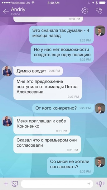 Нардеп от БПП Сергей Лещенко опубликовал скандальную переписку подавшего в отставку министра экономического развития Айвараса Абромавичуса и директора Нафтогаза Андрея Пасишника.В СМИ пишут, что переписка могла послужить поводом для ухода министра в отставку. Лещенко отметил, что когда начался скандал, Пасишник удалил сообщения из этого чата, но Абромавичус успел сделать копию. На скриншоте переписки в Viber, которую опубликовал нардеп в своем блоге на Украинской правде, Пасишник пишет, что его продвигает на должность в Кабмин замглавы фракции БПП Игорь Кононенко. Причем, по его словам, Кононенко уже согласовал вопрос о назначении с премьером Арсением Яценюком. "Меня приглашал к себе Кононенко. Сказал что с премьером они согласовали", - говорится в переписке. ![]() Скриншот: Сергей Лещенко / Украинская правда | |