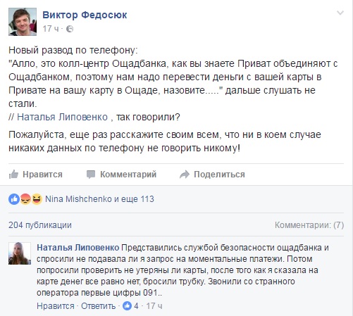 После появления новостей о возможном объединении национализированного ПриватБанка и государственного Ощадбанка пользователи соцсетей стали жаловаться на новую схему мошенничества."Алло, это колл-центр Ощадбанка, как вы знаете Приват объединяют с Ощадбанком, поэтому нам надо перевести деньги с вашей карты в Привате на вашу карту в Ощаде, назовите... Дальше слушать не стали " – написал пользователь Виктор Федосюк на своей странице в Фейсбуке. ![]() Другим пользователям звонили с киевского стационара звонили - код 044. | |