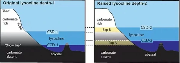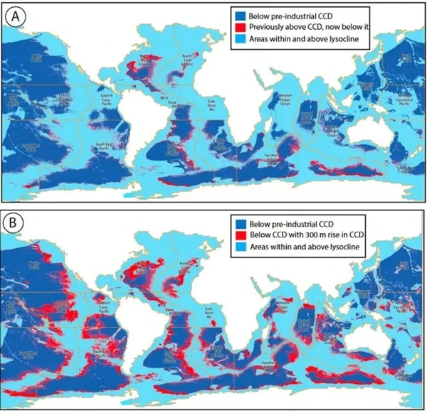 Теперь исследователи полагают, что эти два явления на самом деле связаны. Из-за повышения концентрации углекислого газа в океане его кислотность снижается, в то же время самые глубокие части океана, где растворяется карбонат кальция, становятся все больше, расширяясь вверх от морского дна. Переходная зона, где карбонат кальция становится все более химически нестабильным и начинает растворяться, называется лизоклином. Поскольку океаническое дно относительно плоское, ученые опасаются, что даже подъем лизоклина на несколько метров может быстро привести к появлению больших кислотных областей. Новое исследование показывает, что эта зона океана уже поднялась почти на 100 метров в сравнении с доиндустриальным периодом и, вероятно, поднимется еще на несколько сотен метров уже к 2100 году. Миллионы квадратных километров морского дна потенциально подвергнутся быстрому переходу, в результате которого известковые отложения станут химически нестабильными и растворятся. Верхний предел этой зоны известен как глубина насыщения кальцитом — выше этой зоны отложения морского дна богаты карбонатом кальция, а воды океана перенасыщены им. Глубина компенсации кальцита является ее нижним пределом, ниже которой отложения морского дна содержат мало или совсем не содержат карбонатных минералов. Площадь ниже глубины компенсации кальцита сильно различается в зависимости от сектора океана. Исследования показывают, что уже сегодня она занимает около 41% мирового океана. При этом с момента промышленной революции эта зона, как показывают наблюдения, поднялась во всех частях океана и варьируется от почти нулевого подъема в западной части Индийского океана до более чем 300 метров в северо-западной части Атлантического океана. Если глубина той зоны расширится еще на 300 метров, площадь морского дна под ней увеличится на 10% и займет 51% мирового океана. Новое исследование впервые показало, что глубина компенсации кальцита является биологической границей с отдельными местами обитания выше и ниже нее. Так, выше этой границы наиболее распространенными организмами являются мягкие кораллы, мидии, морские улитки, хитоны и мшанки. Все они имеют кальцинированные раковины или скелеты. В то же время ниже этой границы более распространенными являются морские анемоны, морские огурцы и осьминоги. Известно, что эта более кислая среда уже составляет 141 миллион квадратных километров и, похоже, может расшириться до 35 миллионов квадратных километров. Помимо увеличения глубины компенсации кальцита, части океана в низких широтах теряют виды, поскольку вода становится слишком теплой, а уровень кислорода снижается, и то и другое из-за изменения климата. Таким образом Мировой океан оказался в ловушке: пригодная для жизни зона, по сути, сокращается сверху и снизу — в первом случае из-за увеличения глубины компенсации кальцита, а во втором — из-за глобального потепления планеты. | |
