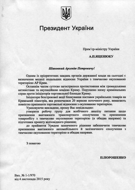 Президент Украины Петр Порошенко обратился к премьер-министру Украины Арсению Яценюку с письмом, в котором предложил безотлагательно создать рабочую группу для всестороннего анализа вопроса о прекращении грузового транспортного сообщения и прекращения товарооборота с временно оккупированной территорией Автономной Республики Крым (в оба направления) и подготовки проекта соответствующего решения.