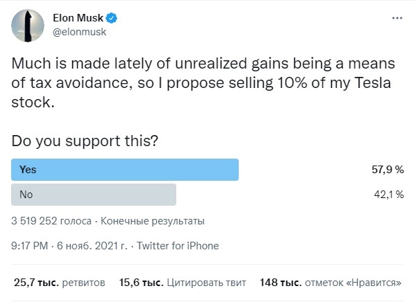 После вопроса в Twitter Маск продал часть акций Tesla | |