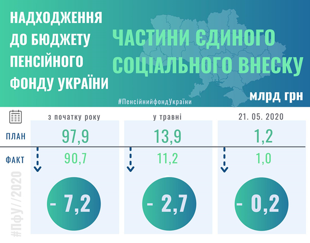Поступления в Пенсионный фонд от единого социального взноса (ЕСВ) с начала года составили 90,7 млрд грн, что на 7,2 млрд грн меньше запланированного. Об этом сообщила пресс-служба Пенсионного фонда.При этом в мае отставание от плана составляет 20%. Так, по данным ПФУ, с начала мая поступления составили 11,2 млрд грн, что на 2,7 млрд грн или 19,5% меньше плана. На 21 мая поступления составили 1 млрд (на 200 млн грн меньше плана). При этом было профинансировано пенсий на сумму 31,4 млрд грн. ![]() | |