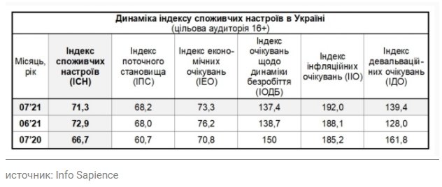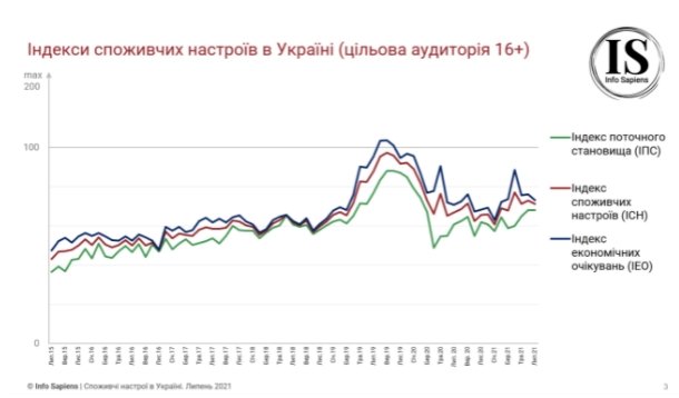 Индекс потребительских настроений сократился на 1,7 пунктов до 71,3 пункта в июле из-за ожиданий ухудшения личного материального положения и снижением оценки перспектив развития экономики страны в ближайшие пять лет. Об этом свидетельствуют данные ежемесячного исследования "Потребительские настроения в Украине" за июль 2021 года, публикуемое организацией Info Sapiens при финансовой поддержке Dragon Capital. Так, индекс ожиданий изменений личного материального положения сократился до 75,3 пункта в июле с 79,4 пункта в июле. Индекс ожиданий развития экономики в ближайший год сократился на 0,9 пунктов до 65,9 пунктов, в ближайшие пять лет - упал на 3,6 пункта до 78,8 пунктов. Общий индекс экономических ожиданий в июле составил 73,3 пункта, что на 2,6 пункта меньше июньского показателя. Оценка текущего материального положения незначительно улучшилась по сравнению с июнем. В частности, индекс текущего личного материального положения составил 61,2 пункта, что на 0,2 пункта выше показателя индекса в июне. Индекс целесообразности крупных покупок вырос на 0,2 пункта до 75,2 пункта. "Большинство составляющих индекса потребительских настроений в июле остаются стабильными и не изменились по сравнению с июнем. Однако тенденция к уменьшению индекса ожиданий изменения личного материального положения, может быть связана с ростом цен на газ" – прокомментировали показатели аналитики Info Sapiens. Исследование потребительских настроений в Украине проводилось GfK Ukraine с июня 2000 года, а с 2019 года его проводит Info Sapiens. Индекс потребительских настроений в Украине определяют на основании выборочного опроса домохозяйств. Опрашивают 1000 человек в возрасте от 16 лет. Выборка репрезентативна по полу и возрасту, учитывает городское и сельское население и размер населенного пункта. Опрос проводился с 3 по 29 июня 2021 года. | |
