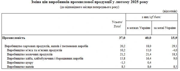 Оптовые цены производителей промышленной продукции в феврале 2025 года по сравнению с февралем прошлого года выросли на 37,0%. Цены в пределах Украины выросли на 40,0%, за пределы Украины - на 15,9%. Об этом сообщает РБК-Украина со ссылкой на данные Госстата. По данным статистического ведомства, в производстве пищевых продуктов, напитков и табачных изделий цены выросли на 20,2%, в частности в пределах Украины - на 18,0%, за пределы Украины - на 29,1%. Больше всего выросли цены в производстве молочных продуктов - на 21,2%, в т.ч. внутри Украины - на 21,4%. В производстве хлеба, хлебобулочных и мучных изделий цены поднялись на 15,8%, в том числе внутри Украины - на 16,4%. В производстве мяса цены выросли на 10,2%, в частности, внутри Украины - на 12,0%. Производители напитков подняли цены на 8,5%, в частности внутри Украины - на 8,6%. Цены на производителей сахара упали за год на 1,5%, в т.ч. внутри Украины выросли на 0,4%.