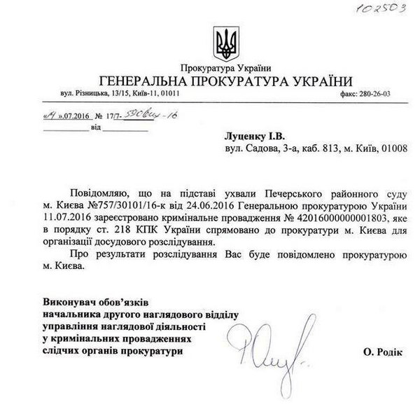 Против главы НАБУ возбуждено дело по жалобе Луценко (документ) | |
