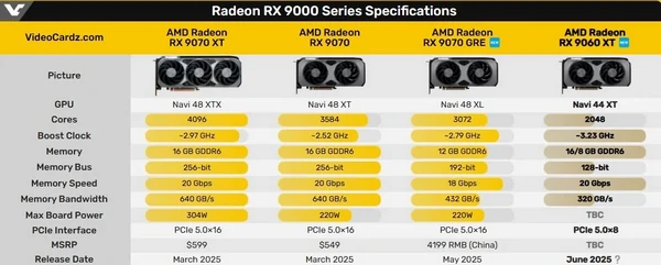 Сообщается, что AMD нацеливается на ценовой диапазон $269-$299 для 8 ГБ Radeon RX 9060 XT и $329-$379 для 16 ГБ модели. | |