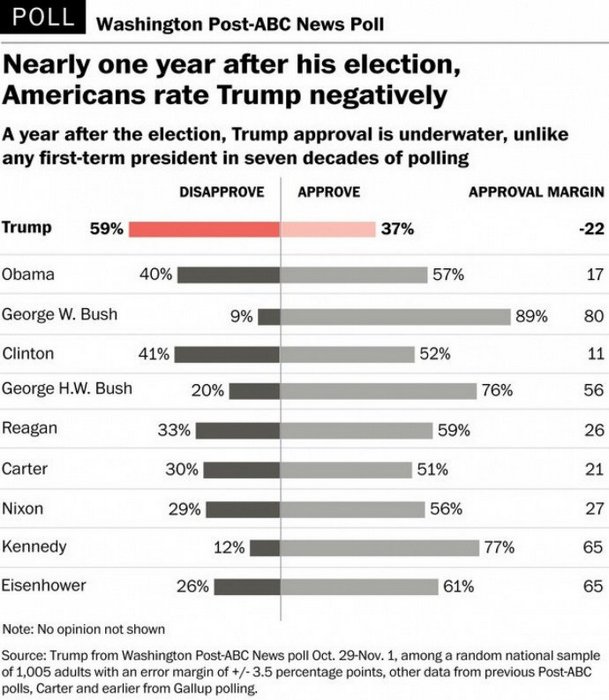 Больше половины американцев считают, что президент Трамп не добился больших успехов в течение первых девяти месяцев своего пребывания на посту. Об этом свидетельствуют данные исследования Washington Post и ABC News.Сегодня рейтинг одобрения Трампа - явно ниже, чем рейтинги всех предыдущих президентов США через год после вступления в должность, за последние 70 лет. Менее 4 из 10 американцев - 37 процентов - одобряют то, как он справляется со своей работой. Рейтинг неодобрения президента достиг 59 процентов, причем 50 процентов заявили, что они категорически не одобряют работу, которую он выполняет. Он - единственный президент, начиная от Гарри Трумэна, получивший такую низкую поддержку. Следующим худшим президентом был Билл Клинтон. Примерно через 100 дней его президентства, 42 процента сказали, что он многого добился на посту. Сегодня это число упало до 35 процентов. 65 процентов говорят, что он сделал "не много" или "мало или ничего". Эта цифра выросла с весны, когда она составляла 56 процентов. Из них 43 процента всех американцев дают Трампу наименьшую возможную оценку, говоря, что он сделал "мало или ничего". Опрос был проведен с 29 октября по 1 ноября среди случайной национальной выборки из 1 005 взрослых с погрешностью плюс или минус 3,5 процентных пункта. ![]() | |