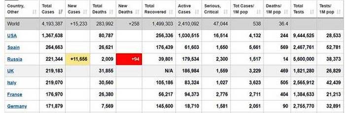 В России число заразившихся коронавирусной инфекцией превысило 221 тысячу человек. По этому показателю страна вышла не третье место в мире.Согласно данным опертивного штаба на понедельник, 11 мая, за сутки выявили еще 11 656 заболевших. Выздоровел на данный момент 39 801 человек, 2 009 человек умерли. Таким образом Россия обошла Великобританию и Италию, которые еще не публиковали данные за понедельник. ![]() | |