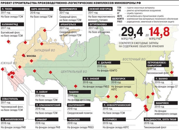 Минобороны намерено создать 24 перевалочно-логистических комплекса, которые к 2020 году должны заменить 330 баз и складов на территории РФ, пишет российское издание Коммерсант.Сообщается, что один из них будет размещен в Крыму, еще пять - недалеко от границы с Украиной. Издание также опубликовало карту с запланированными комплексами. Как отмечает издание, в Минобороны объясняют такие планы желанием снизить расходы военного ведомства почти вдвое - до 14,8 млрд рублей. ![]() "Появление ПЛК позволит не только снизить расходы почти вдвое - до 14,8 млрд руб., но и расширит логистические возможности для снабжения армии", - говорит источник в ведомстве. Согласно проекту строительства, РФ к 2017 году обустроит такой центр в Севастополе, в 2016 году – в поселках Михайловское, Койсуг, Краснофлотский, в Армавире и Бутурлиновке на восточных границах Украины. В статье отмечается, что в подмосковном Наро-Фоминске строится ПЛК "Нара", который должен будет обеспечивать хранение около 220 тысяч тонн материальных средств и порядка 4700 единиц вооружений и спецтехники. | |