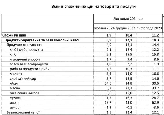Средние цены на продукты питания и безалкогольные напитки в Украине в ноябре 2024 года по сравнению с ноябрем прошлого года выросли на 14,3%. Подешевел только сахар. Об этом сообщает РБК-Украина со ссылкой на Государственную службу статистики (Госстат). По данным статистического ведомства, за последний года среди продуктов больше всего подорожали овощи - на 62,9%. Кроме того, сливочное масло подорожало на 30,7%, яйца - на 30,6%. Цены на фрукты выросли на 24,7%, на молоко - на 16,6%, хлеб - 15,8%, на сыр и творог - на 14,6%. Подсолнечное масло подорожало за год на 12,5% хлеб и хлебопродукты - на 12,2%, безалкогольные напитки - на 12,1%, рыба и продукты из рыбы - на 11,1%, макаронные изделия - на 8,6%, мясо и мясопродукты - на 1,9%. В то же время сахар подешевел за год на 3,6%. Продуктовая инфляция в УкраинеПо данным НБУ, продовольственная инфляция стремительно ускорилась из-за эффектов жаркой погоды без дождей летом и осенью текущего года, что сказалось на урожайности, сроках созревания и качественных параметрах продовольственной продукции, в первую очередь, ряде овощей и фруктов. По данным продовольственного агентства ООН (ФАО), в ноябре 2024 года мировые оптовые цены на основные продукты питания были на 5,7% выше своего значения годом ранее. В частности, мировые цены на сливочное масло, выросли четырнадцатый месяц подряд, достигнув нового рекордного максимума из-за сильного внутреннего и международного спроса на фоне ограниченных запасов, особенно в Западной Европе. | |