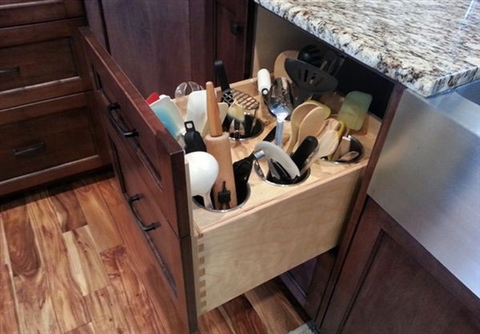 Конечно же, можно легко найти один идеально подходящий вариант, который воплотит в жизнь желаемую мечту о функциональной кухне. Следовательно, после этого останется только комбинировать детали. Но даже после произведенного ремонта, дальше могут понравиться и другие новые идеи, которые просятся для реализации.Не стоит огорчаться! Никогда не поздно внести в существующий дизайн кухни, что-нибудь новенькое и современное, добавив при этом всего несколько простых и стильных элементов или аксессуаров. Плетеные корзины и подносы для мелочей на кухнеВсевозможные плетеные изделия на кухне – просто незаменимы! К примеру, если у вас на кухне есть открытые полки, то их смело можно заполнить такими изделиями с нужными вещами в середине. Выйдет очень аккуратно и удобно.Встроенные контейнеры на кухне для мусораНаверное, никто не желает видеть мусорные контейнеры, зайдя на кухню, а еще больше нет желания их наблюдать или спотыкаться, когда вы готовите еду. В таком случае, отлично подойдет выдвижной ящик в тумбе, в котором и поместится ведро с мусором. Благо, подходящее ведро для мусора купить не составит никакого труда. В магазинах есть все, что только можно пожелать. Таким образом, вы можете не только один контейнер использовать, но по возможности тумбы, спрятать несколько мусорных ведер.Ящик с кухонными принадлежностямиКакая может быть кухня без множества кухонных принадлежностей? Обычно, у многих хозяек все принадлежности лежат в одном большом ящике, да и то насыпью. Главное, когда нужно найти предмет, он как всегда снизу. Их подобных ситуаций есть очень простой и оригинальный выход. В этом ящике необходимо сделать несколько отсеков, в каждом из которых будет находиться кухонная утварь.Приправы на магнитахВсе домохозяйки всегда сталкиваются с проблемой в хранении большого количества баночек с разными приправами. Оригинальная идея для решения проблемы – использование обычных магнитов. На стену, аккуратно прикрепите металлическую планку, к которой смело можно прикреплять баночки или даже пакетики со специями. | |