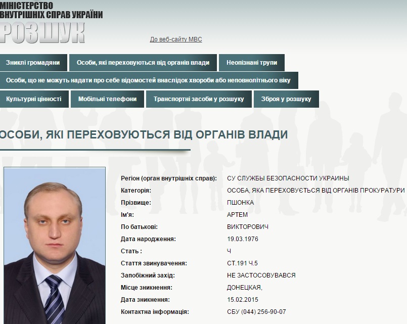 СБУ объявила в розыск сына Пшонки | |
