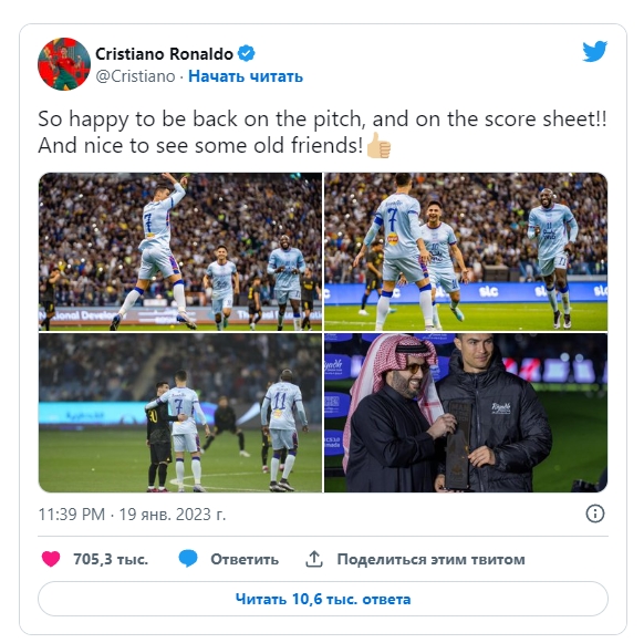 Криштиану Роналду остался доволен проведенным матчем с ПСЖ. Об этом португальский форвард Аль-Насра рассказал у себя на странице в соцсети. Несмотря на то, что сборная звезд чемпионата Саудовской Аравии под его предводительством проиграла в товарищеском матче парижанам, португальцу поединок понравился. "Так счастлив вернуться на поле и забить гол! И приятно видеть старых друзей!" – написал Роналду в своем Твиттере. | |