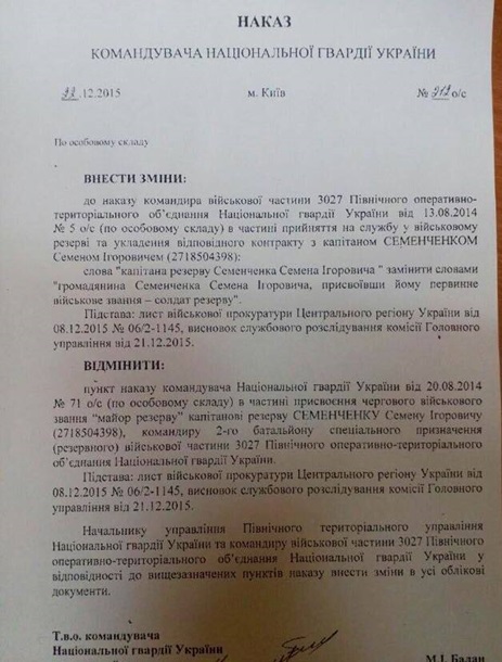 Национальная гвардия Украины обнародовала приказ о лишении офицерского звания народного депутата от Самопомочи Семена Семенченко.Соответствующий документ от 22 декабря 2015 года есть в распоряжении Украинская правда. В приказе, подписанном на тот момент и.о. командующим Нацгвардии Николаем Баланом, указано, что на основании письма военной прокуратуры Центрального региона следует внести изменения в приказ о принятии Семенченко на службу. А слова "капитана резерва Семенченко "следует заменить словами "гражданина Семенченко, присвоив ему первичное воинское звание - солдат резерва", говорится в приказе. Изменения также должны быть внесены во все соответствующие документы. ![]() | |
