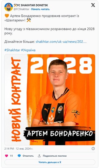 Шахтер объявил о продлении контракта с полузащитником Артемом Бондаренко. Как сообщает пресс-служба "горняков", 23-летний украинский полузащитник подписал новое соглашение с донецким клубом, рассчитанное до 2028 года. Остальные детали соглашения не разглашаются. Отметим, что предварительный контракт Бондаренко с Шахтером истекал летом следующего года. Напомним, Бондаренко - выпускник Академии Шахтера. За главную команду дебютировал 1 марта 2020-го в поединке УПЛ с Ворсклой. На счету 23-летнего полузащитника 66 официальных матчей за Шахтер, 12 забитых мячей и 11 ассистов. В сезоне-2023/24 Бондаренко принял участие в 14 играх дончан и отличился 1 забитым мячом. | |