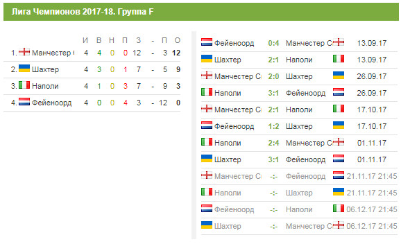 Донецкий Шахтер в четвертом матче группового раунда Лиги Чемпионов обыграл голландский Фейеноорд со счетом 3:1. Игра прошла в Харькове на стадионе "Металлист".Шахтер первым пропустил, но тут же отыгрался усилиями Факундо Ферейры. Дубль Марлоса принес горнякам победу. Подопечные Пауло Фонсеки с 9 очками закрепились на втором месте в группе и имеют хорошие шансы на продолжение участия в Лиге Чемпионов. Фейеноорд же потерял все шансы на выход в евровесну. ![]() Шахтер – Фейеноорд 3:1Голы: Феррейра, 14, Марлос, 17, 68 – Йоргенсен, 12 Шахтер: Пятов – Бутко, Хочолава, Ордец, Исмаили – Фред, Степаненко – Марлос, Тайсон, Бернард (Алан Патрик, 72) – Феррейра (Дентиньо, 89) Фейеноорд: Джонс – Ньюкооп, Тапиа (Дикс, 72), Жюст, Хапс – Амрабат, Эль-Ахмади, Вильена – Бергейс, Йоргенсен (Ларссон, 80), Боэтиус Предупреждения: Хочолава – Бергейс, Эль Ахмади | |