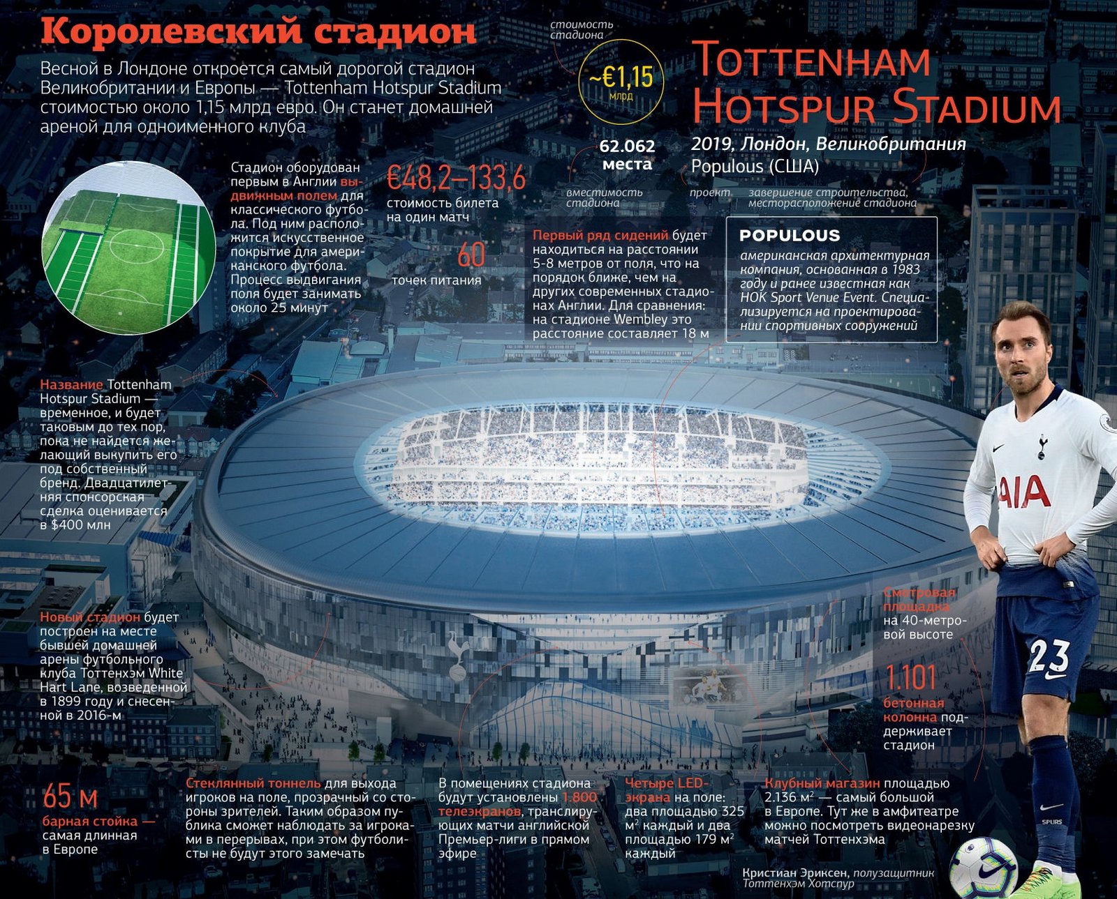 ![]() Фото: populous Tottenham Hotspur Stadium будет оборудован 62,062 местами, а стоимость билета на один матч составит от €48,2 до €133,6.
