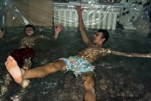 На этой неделе в Сети появились очень интересные снимки - фото бассейна в квартире. Идея создания такого бассейна принадлежит школьникам из Орловской области. Изобретательные парни сделали бассейн прямо у себя в квартире.Пара ребят, устроили бассейн в обычной квартире, они просто обтянули комнату полиэтиленовой пленкой, закрепили ее с помощью скотча, и набрали туда воды.Дном для бассейна служит пол квартиры с ковром. Подростки, видимо, так устали от жары, что решили устроить бассейн прямо в квартире. Они затянули комнату в хрущевке обычной пленкой, закрепили ее при помощи скотча и налили туда воды. Уже три недели подряд столбики термометров в Орле и области зафиксированы у отметки в 30 градусов и выше. На пляжах не хватает мест всем желающим охладиться. Но изобретательные парни, создав себе собственный бассейн, таким образом решили спастись от жары. Фото, где подростки радостно плещутся в воде, мгновенно разлетелись по Сети, и вызвали множество дискуссий и вопросов. В региональном МЧС изобретение ребят не оценили, и отметили, что повторять такие опыты у себя дома не стоит. Поклонников парней и интернет-пользователей в Сети, больше всего интересует, каким образом потом подростки выливали всю эту воду? Как отреагировали на их изобретение родители? И в результате как оценили их идею соседи, которые живут на нижнем этаже? | |