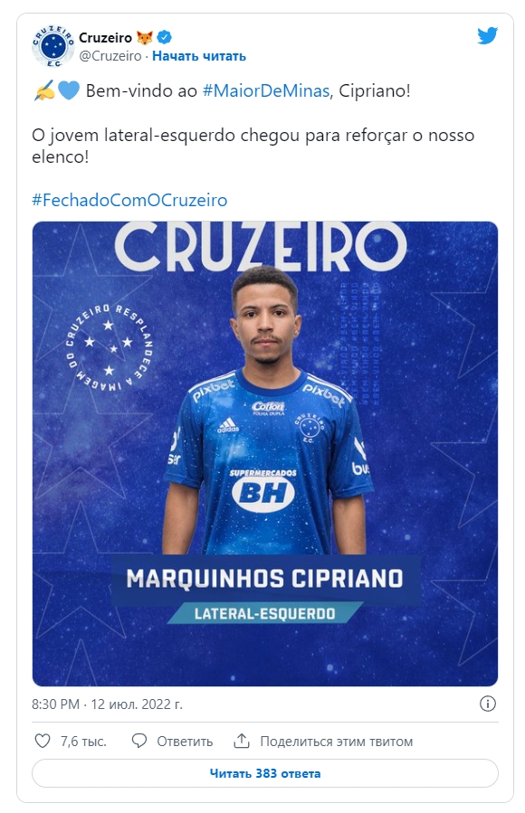 Донецкий Шахтер потерял еще одного футболиста из-за нового правила ФИФА. Воспользовавшись возможностью на год остановить свой контракт, клуб покинул еще один бразильский легионер. Крузейро, возглавляющий сейчас второй бразильский дивизион, объявил о переходе защитника Маркиньоса Сиприано. 23-летний футболист пополнил состав бразильской команды на правах годичной аренды. Напомним, что накануне Сиприано дал интервью и сообщил, что решающим фактором при выборе команды стало имя известного в прошлом бразильского форварда Рональдо, которому принадлежит Крузейро. Отметим, что Сиприано так и не стал основным игроком в составе Шахтера. Перейдя в донецкую команду летом 2018 года из Сан-Паулу за один миллион евро, он провел за это время всего 26 поединков, записав на свой счет один гол и два ассиста. Прошлый сезон Сиприано провел в аренде в Сьоне. За швейцарский клуб бразилец сыграл 33 матча, в которых сделал две результативные передачи. | |