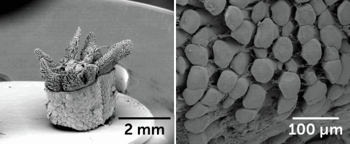 Хвост ящерицы состоит из ряда сегментов, которые соединяются в ряд, они входят друг в друга, как вилки в розетки. Хвост может отломиться в любой из этих точек, называемых плоскостями перелома, в зависимости от того, какой частью хвоста ящерица должна пожертвовать. "У хвоста ящерицы должно быть достаточное количество таких внутренних связей, чтобы он не отрывался легко. Но он также должен сниматься всякий раз, когда это необходимо", — поясняет Сонг. Между каждым сегментом таких отростков в хвосте у ящерицы — восемь конусовидных пучков мышц, расположенных по кругу. Они аккуратно входят в соответствующие углубления, состоящие из относительно гладких стенок. Каждый зубец, в свою очередь, покрыт лесом выступов или микростолбиков, которые напоминают крошечные грибы. Начало перелома хвоста можно остановить на месте. Каждая выемка и канавка помогают: микростолбики с нанопорами усиливают адгезию в 15 раз больше, чем гладкие зубцы без микростолбиков, и немного больше, чем микростолбики без нанопор. Иерархическая структура зубца, столба и поры обеспечивает баланс: не слишком тесно, не слишком свободно. Эта адаптация важна для ящериц, чтобы оптимизировать их выживание. Это дорогостоящий защитный механизм, который влияет на способность ящерицы бегать, прыгать, спариваться и убегать от встречающихся ей хищников. Поэтому важно, чтобы ящерица отказывалась от своей конечности только в случае необходимости. | |