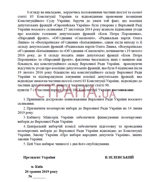 В СМИ появился проект указа новоизбранного президента Владимира Зеленского о досрочном роспуске Верховной Рады и назначении внеочередных выборов Конституция Украины, который он планирует подписать после инаугурации 20 мая. Соответствующий документ в пятницу, 17 мая, обнародовала Страна.Отмечается, что проект журналистам передали источники в окружении Зеленского, уточнив, что это предварительный вариант. И окончательный текст не утвержден, как и не утверждено окончательное решение о роспуске Рады. В документе говорится, что, начиная с 19 февраля 2016 года, после выхода из коалиции Батькивщины и Самопомощи, в двух оставшихся фракциях (БПП и Народный фронт) находится менее 226 депутатов. То есть менее половины конституционного состава парламента. На этом основании у президента есть право распустить Раду. "Если в течение одного месяца в Верховной Раде Украины отсутствует коалиция депутатских фракций, которая бы отвечала требованиям статьи 83 Конституции Украины, то президент Украины имеет право досрочно прекратить полномочия Верховной Рады Украины", - говорится в проекте Указа. Учитывая изложенное, президент постановляет: