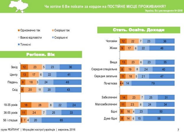 30% опрошенных украинцев скорее хотели бы выехать за границу на постоянное проживание, почти 65% скорее не хотели бы, а 40% хотели бы работать за границей.Об этом свидетельствует опрос, проведенный социологической группой "Рейтинг" в сентябре. ![]() ![]() ![]() ![]() При этом для респондентов, которые имеют детей до 16 лет, желание обеспечить лучшее будущее для детей является основным мотивом (52%) выезда за границу на постоянное проживание. Среди прочих мотивов выезда за границу на постоянное местожительство: 13% – с целью лучшей самореализации, 8% – из-за отсутствия чувства безопасности в Украине, 7% – для получения лучшего образования или лучшего медобслуживания, 5% – из-за лучших условий ведения бизнеса за границей. Среди желающих работать за границей лишь четверть оценила свои шансы на работу за границей как значительные, еще половина – как незначительные, 12% считают, что у них вообще нет шансов, каждый десятый не определился. Социологи интервьюировали две аудитории: 2000 граждан от 18 лет – 16-22 сентября (погрешность не больше 2,2%) и 450 посетителей визовых центров во Львове, Харькове и Житомире – 16-27 сентября (погрешность не более 5%). | |