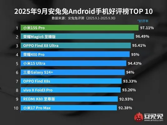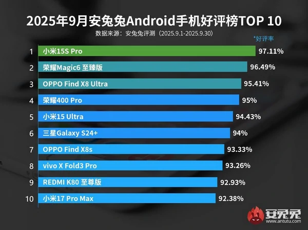 Команда бенчмарка AnTuTu опубликовала очередной рейтинг, только на этот раз не самых производительных смартфонов, а топ мобильных устройств на базе Android с наивысшим одобрением со стороны пользователей. Первое место в списке занял Xiaomi 15S Pro – экспериментальный флагман от китайцев на процессоре собственной разработки. Его работой довольны 97,11% пользователей. На второй строчке разместился Honor Magic 6 Ultimate Edition с результатом 96,49%. Третьим стал Oppo Find X8 Ultra, набравший 95,41% положительных отзывов. В топ-10 вошли еще три смартфона Xiaomi – Xiaomi 15 Ultra (95,58%), Redmi K80 Ultra (92,93%) и Xiaomi 17 Pro Max (92,38%). Другие Андроиды, попавшие в рейтинг: Honor 400 Pro (95%), Galaxy S24+ (94%), Oppo Find X8s (93,33%) и vivo X Fold3 Pro (93,26%). | |