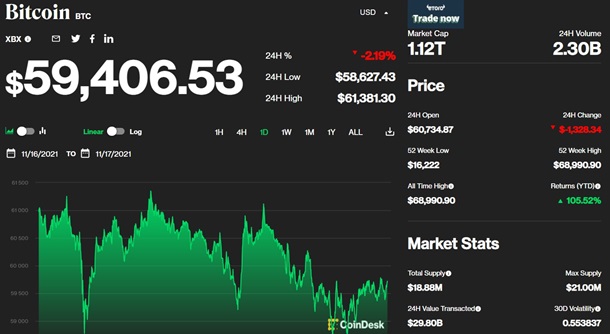 Стоимость Bitcoin упала ниже 60 тысяч долларов | |