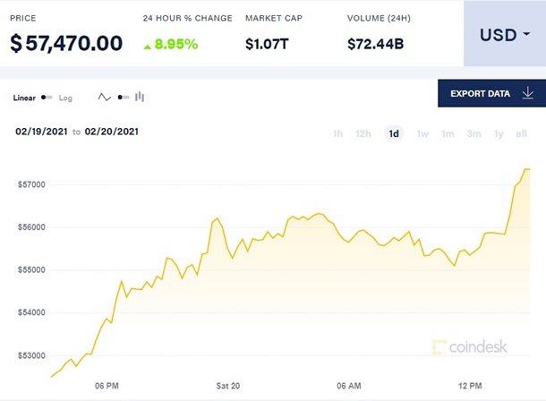 Самая популярная криптовалюта биткоин продолжает устанавливать новые рекорды. В субботу, 20 февраля, впервые был преодолен рубеж в 57 тысячи долларов. Об этом свидетельствуют данные CoinDesk.Так, по состоянию на 15:30 по Киеву криптовалюта на пике подорожала еще на 8,95% и достигла цены 57 470 доллара. Общая стоимость рыночной капитализации биткоина также установила рекорд, достигнув 1,07 трлн долларов. Рост за сутки составил 72,44 млрд долларов. Доля биткоина занимает более 70% всего глобального рынка криптовалют. Напомним, стоимость биткоина резко выросла в последние месяцы. Еще в начале октября он стоил около 11 тысяч долларов. Подорожание произошло на фоне активного притока институциональных инвесторов в криптовалюты. По данным аналитиков рынка, аппетит к рискованным активам, которые являются криптовалюты, поддерживают масштабные вливания Федеральной резервной системы США и центробанков других стран, а также растущие ожидания, что пандемия коронавируса будет взята под контроль благодаря вакцинам. | |